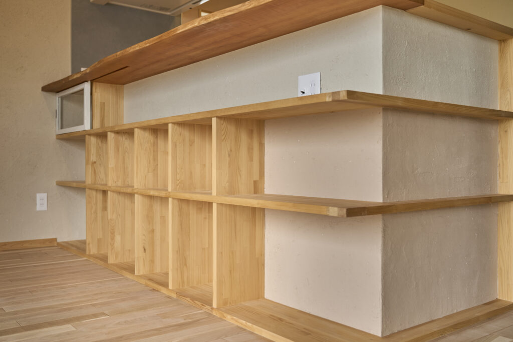 キッチン裏には一枚板の天板を使った造り付けの収納スペース