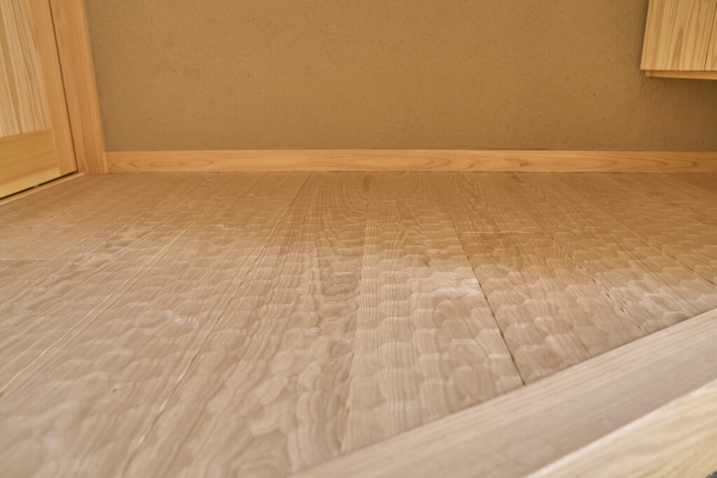 玄関ホールの床には名栗加工が施されており、目と足の裏で素材を楽しむ