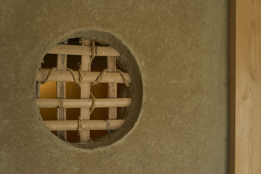 和室とリビングを間仕切る壁の開口部には塗り壁下地の竹編みがアクセントに